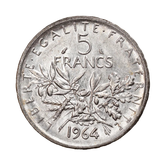 Gravée par  Louis Oscar Roty, la 5 Francs Semeuse dont le poids est de 12 grammes d’argent 835/000 soit 10.02 grammes d’argent fin. Elle sera produite à 195 282 126 exemplaires entre 1959 et 1969.